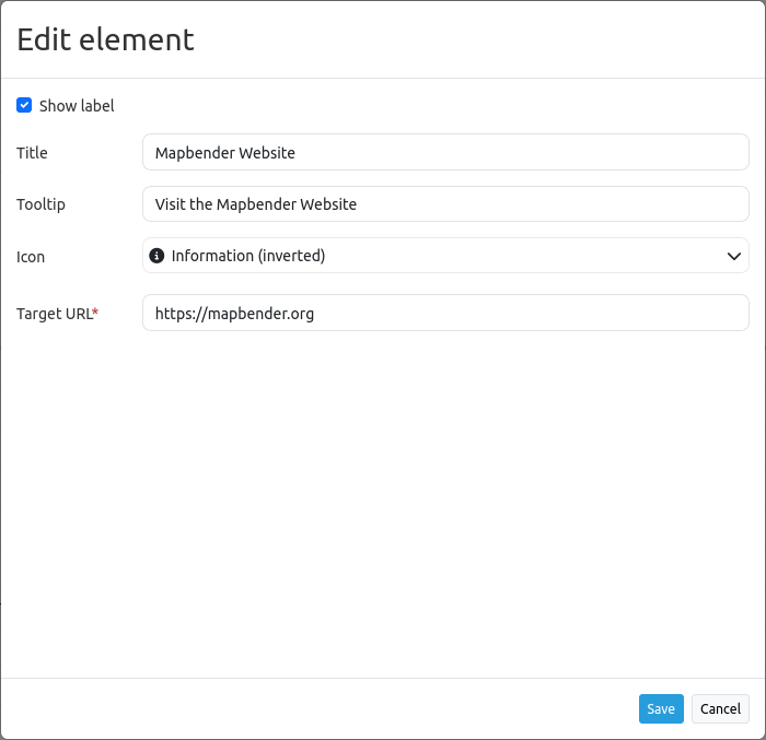Title: Title of the element. The title will be listed in Layouts and allows to distinguish between different buttons. It will be indicated if “Show label” is activated.
