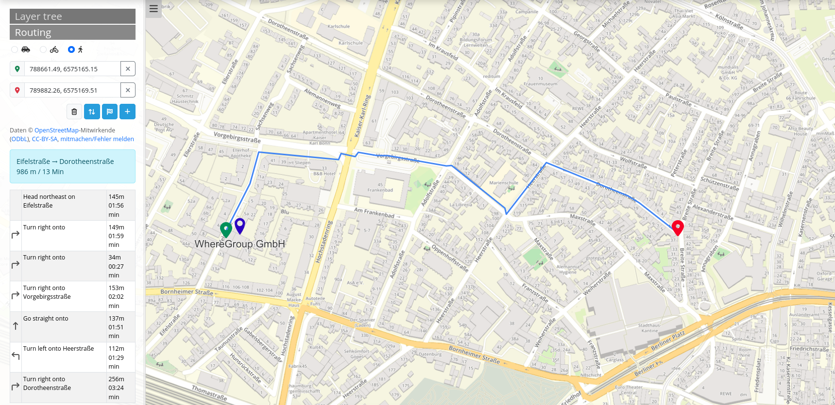 The routing element adds a routing tool to an application. After specifying the start, destination and any intermediate points, a suitable route is displayed on the map. Information about the route can also be displayed.