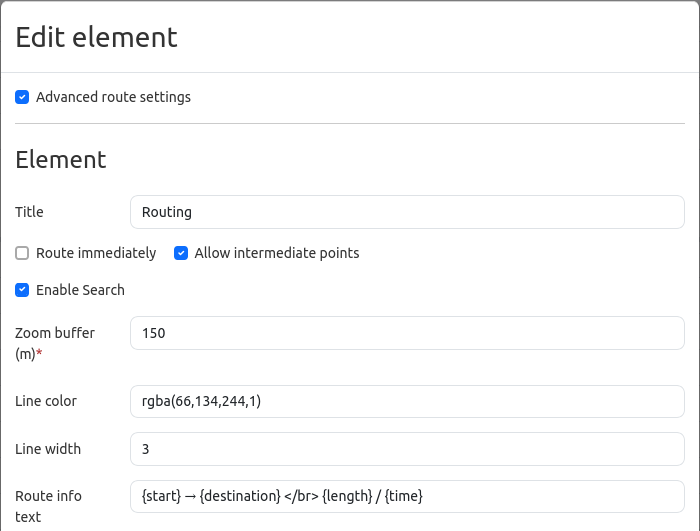 Route info text: Option to add an info text for the rout (default: {start} → {destination} </br> {length} will take {time}).