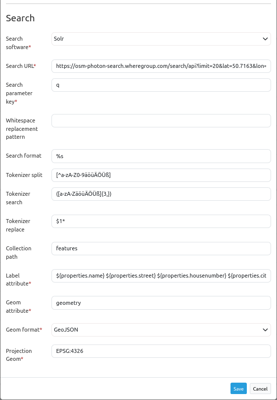 Search software: Select the search service (default: Solr).