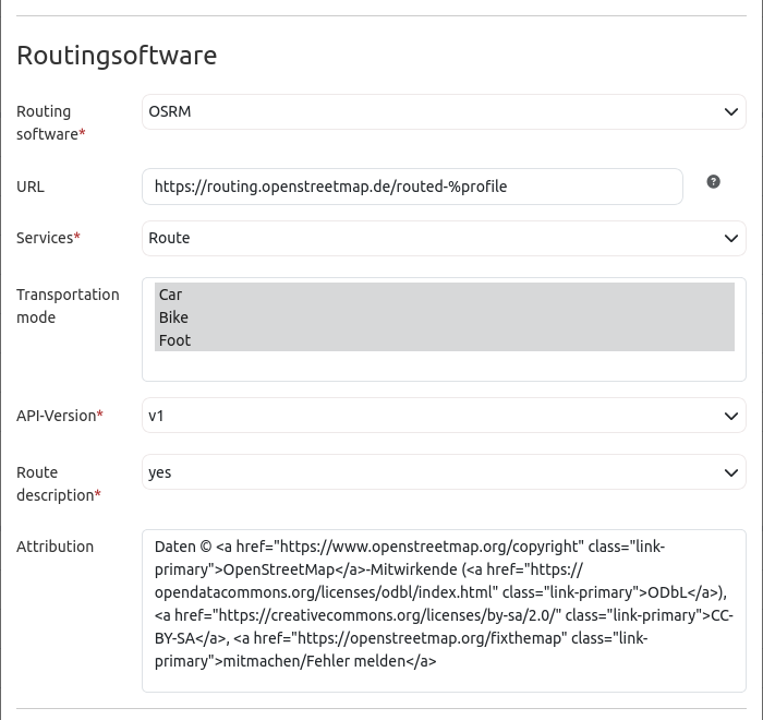 Transportation mode: Select the routing profiles (car, bicycle, pedestrian). It is also possible to select more than one (default: none).