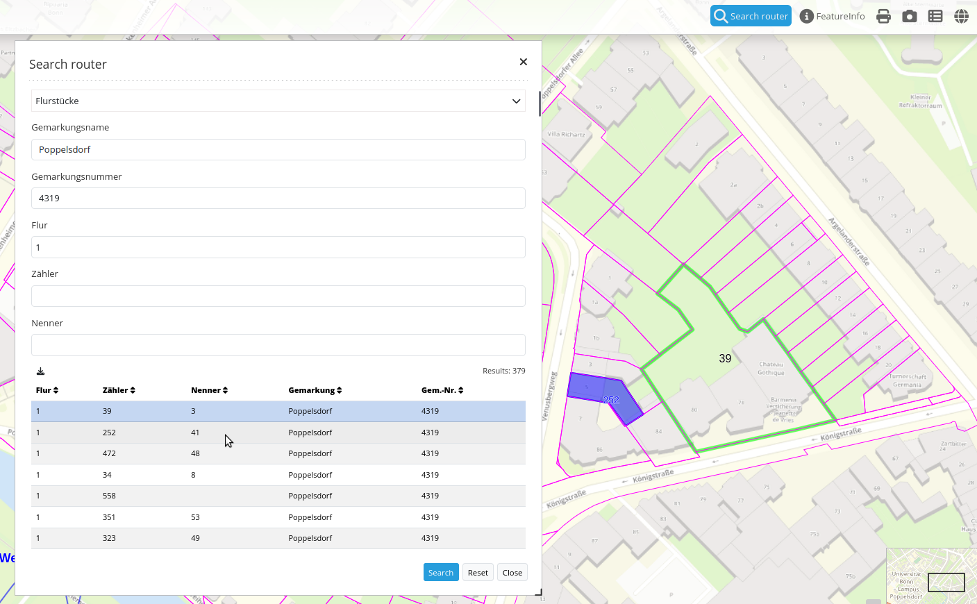 The Search Router element enables users to locate items within the map by interfacing with a specified database connected via the Backend. Both the search form and table output are customizable and facilitate generic SQL search functionality via PostgreSQL tables. This is achieved through the storage of geometries in the database, allowing users to query and display dynamic results on the map.