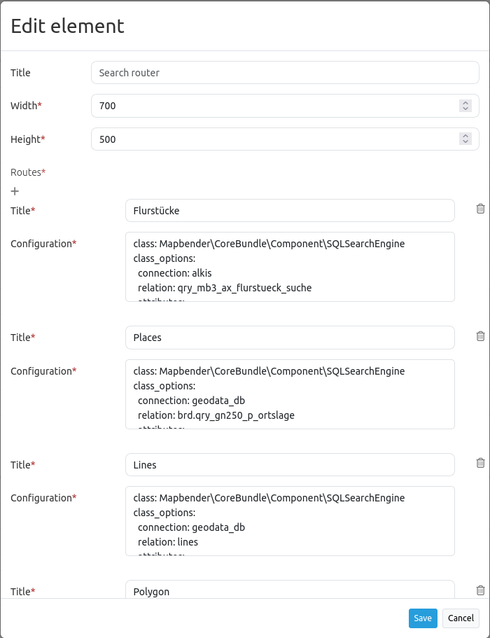 ),Configuration: Field to configure the search (appears when a search is added to Routes by using