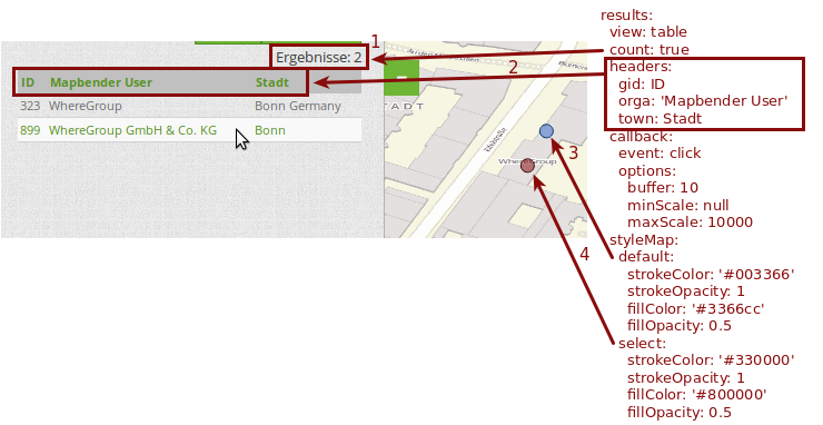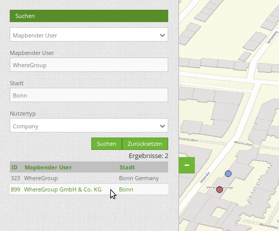 A complete search for the Mapbender User WhereGroup, in the Town Bonn, of the Usertype Company and the found results will look like this: