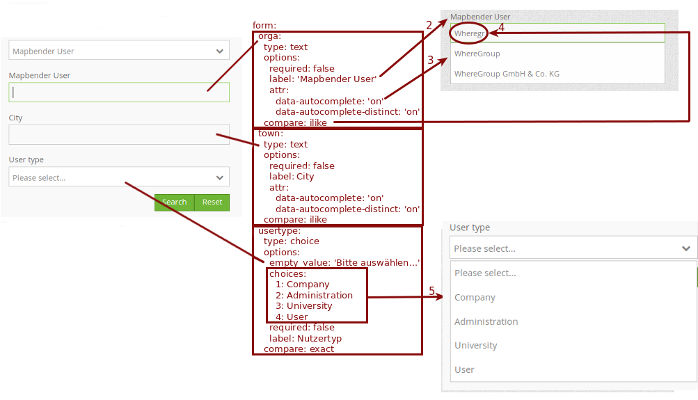 Displayed is the excerpt of the yaml-definition configuring the formula. Columns orga, town and usertype are used in the formula and implemented as the fields Mapbender User, Town and Usertype. Mapbender User and Town are type text, Usertype can be of various types.