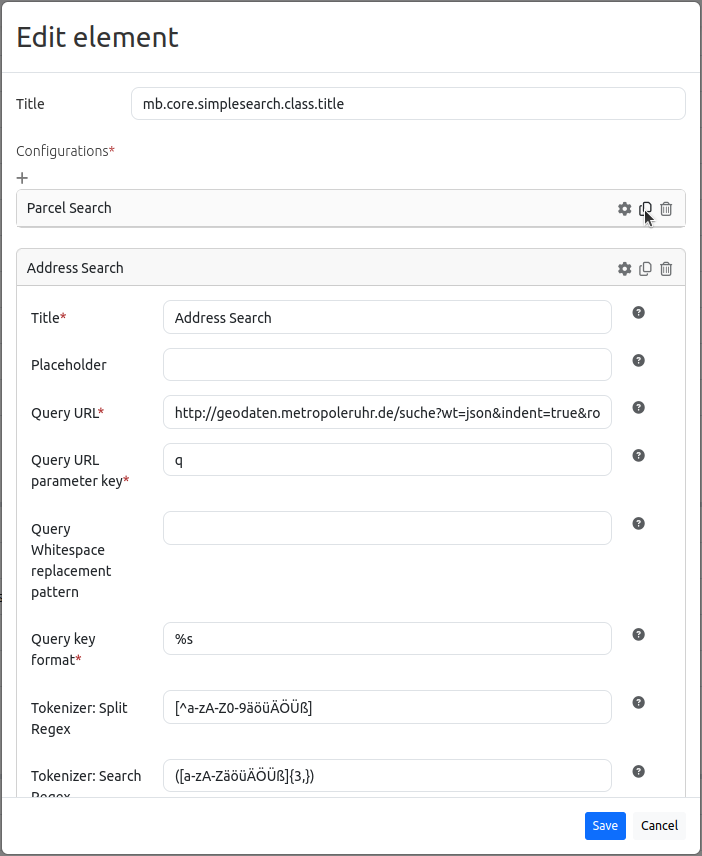 The element can handle multiple search configurations. It is possible to duplicate a search form in the backend configuration window with the Copy button: