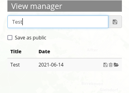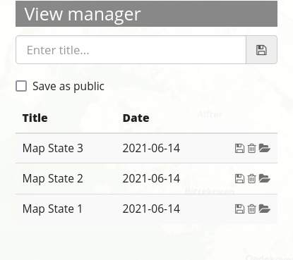 Each state must be given a title for reidentification. For saving the current map view as a new state, enter a title and click on the adjoined save button.
