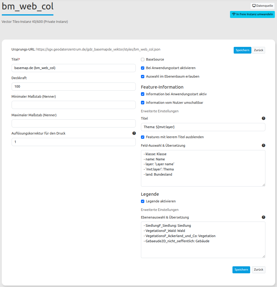 Die Vector Tiles-Instanz-Einstellungen bieten folgende Konfigurationsmöglichkeiten: