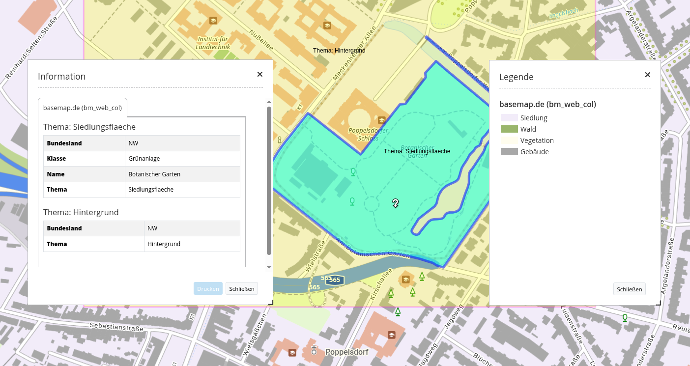 Der Screenshot zeigt eine Mapbender-Anwendung mit aktivierter Legende und Feature-Information.