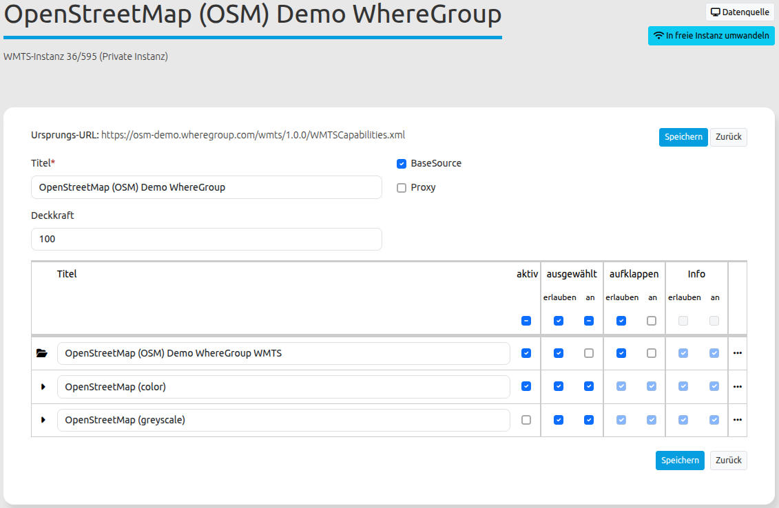 Eine Layerset-Instanz kann in der Bearbeitungsansicht über den blauen Button “In freie Instanz umwandeln” umgeändert werden. Über den gleichen Button lässt sich eine freie Instanz wieder in eine private Instanz umwandeln.