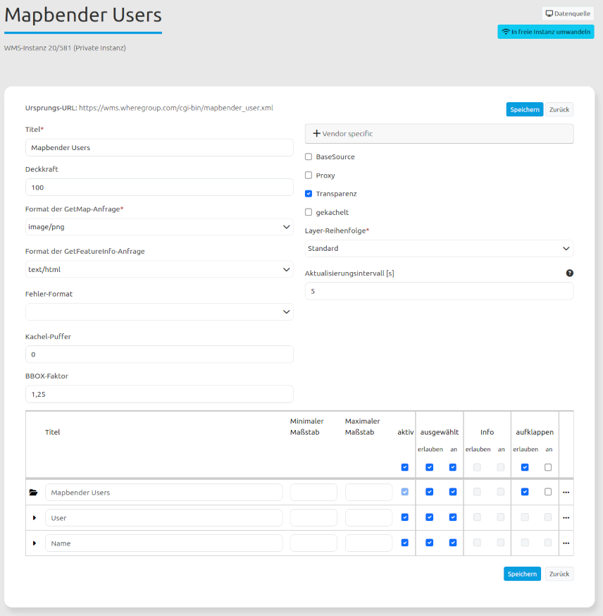 Der Screenshot zeigt die private Instanz 20/581 basierend auf einem WMS-Dienst. Die zugehörige Datenquelle ist die Nr. 20. Die Layerset-Instanz selbst hat die Laufnummer 581.