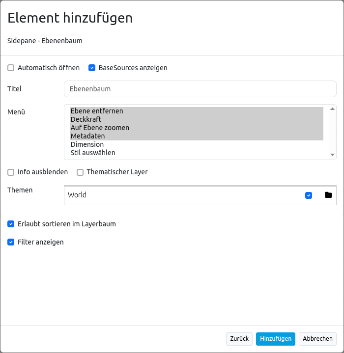 Konfiguration des Kartenelements für den thematischen Ebenenbaum.