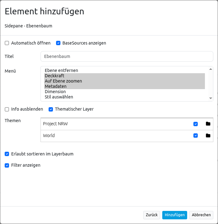 Wenn wir im Thema “World” die Standardeinstellungen beibehalten und im Thema “Project NRW” die anderen Optionen aktivieren, sieht die Konfiguration des Elements wie folgt aus: