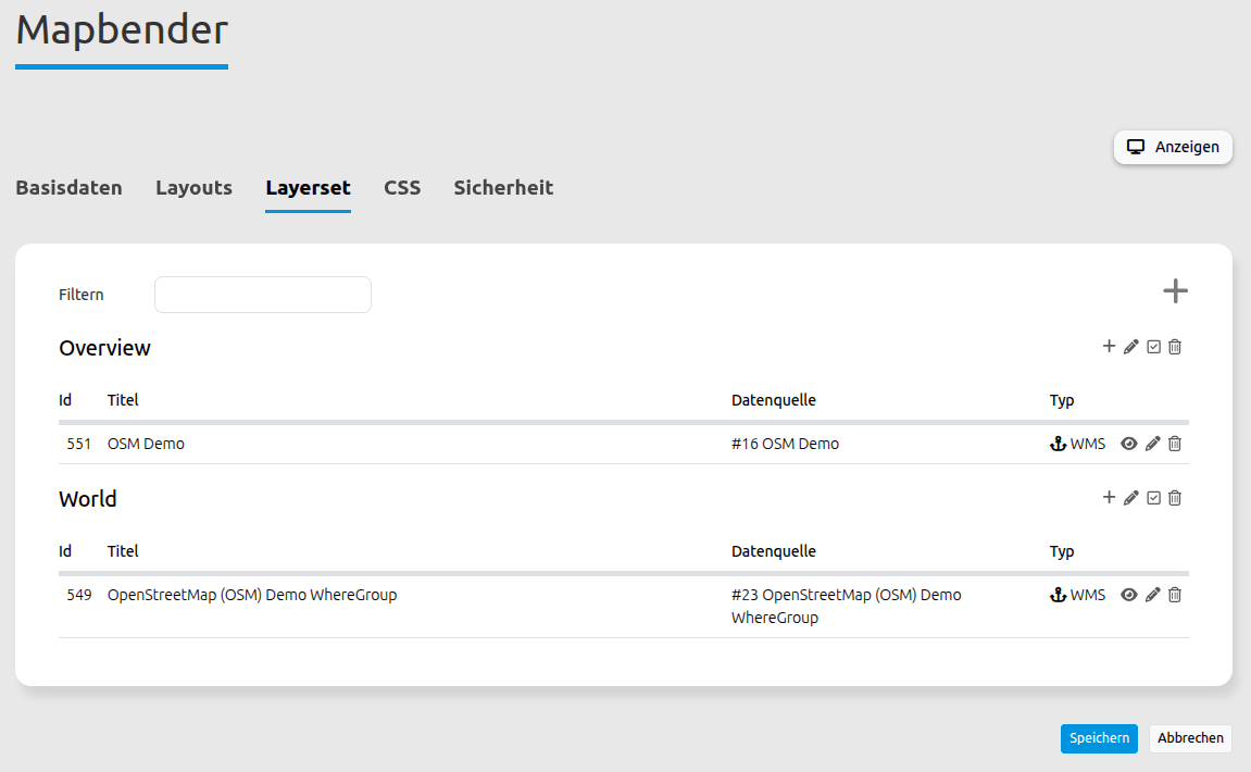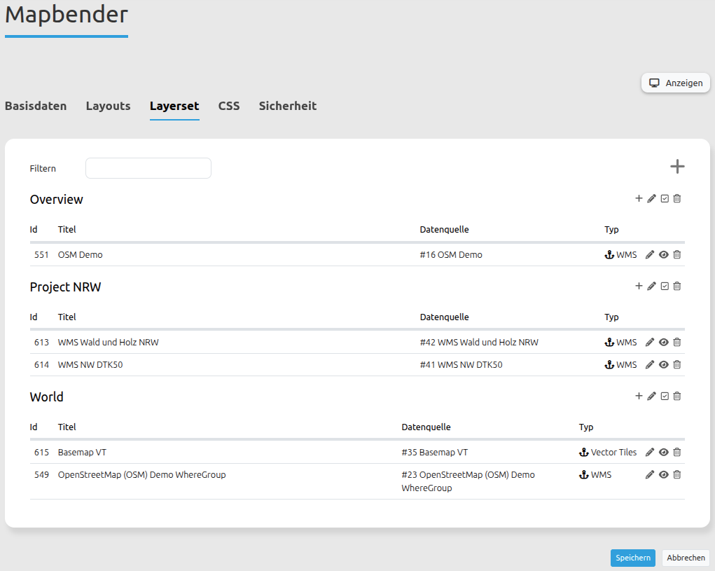 Über den Reiter Layerset können Layersets definiert und Datenquellen in eine Anwendung eingebunden werden.