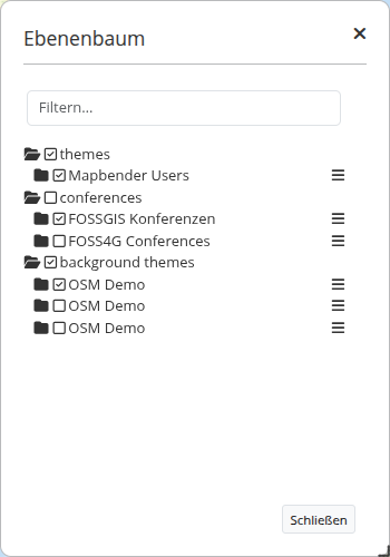 Wir haben die Layersets somit als thematische Gruppen in den Ebenenbaum eingebunden. Durch die Konfiguration der thematischen Layer stellt sich der Ebenenbaum in der Anwendung nun wie folgt dar:
