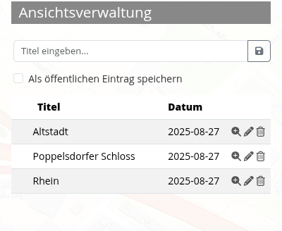 Das Element Ansichtsverwaltung erlaubt das Speichern und Wiederverwenden von Kartenansichten. Folgende Kartenparameter sind Teil einer Ansicht:
