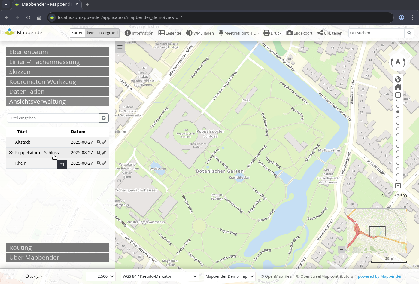 Jede gespeicherte Ansicht erhält eine eindeutige ID, die verwendet werden kann, um die entsprechende Ansicht direkt zu laden. Zum Beispiel kann die Ansicht mit dem Titel “Poppelsdorfer Schloss” über den folgenden URL-Parameter aufgerufen werden: