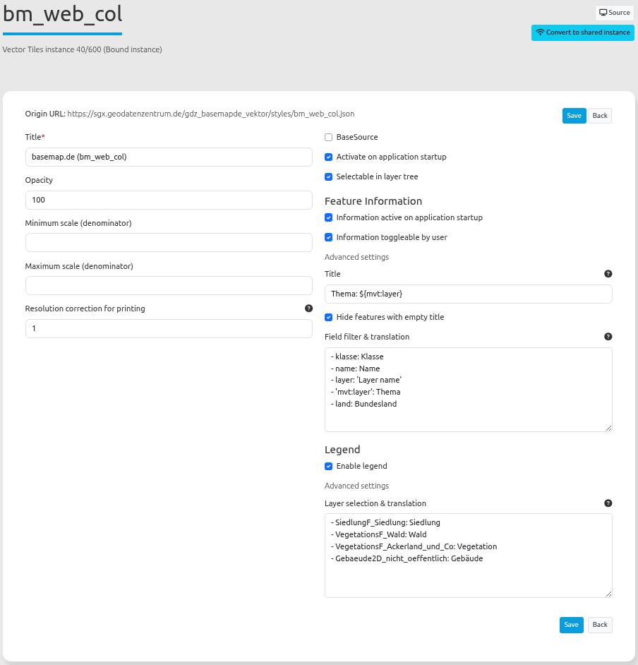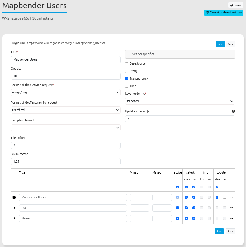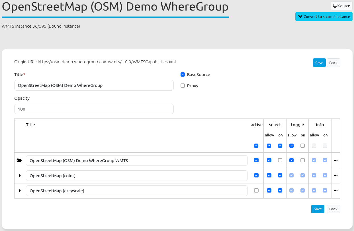 The screenshot above shows the bound instance 20/581 based on a WMS service. The associated data source is number 20, the layer’s instance itself has the number 581. It is based on the WhereGroup OSM service and can be configured for the application in this dialog.
