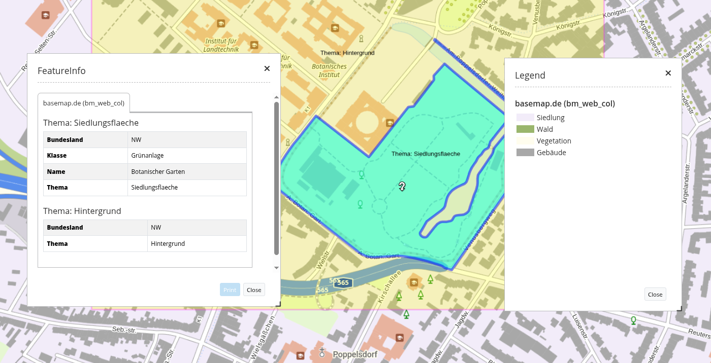 There are also some WMS services that only support a maximum image size that cannot be used with the high resolutions request that Mapbender can call. The Fullscreen template can be sized to the maximum screen width and the requested map image is then approximately the width and height of the visible browser window.