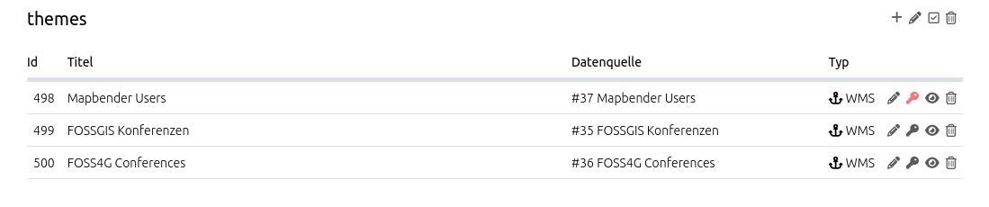 Durch einen Klick auf Layersets wird die Übersichtsseite aufgerufen, auf der die Layersets konfiguriert werden. Jedes Layerset wird als Liste mit zugehörigen Diensten dargestellt. Die Übersichtsseite bietet folgende Funktionen: