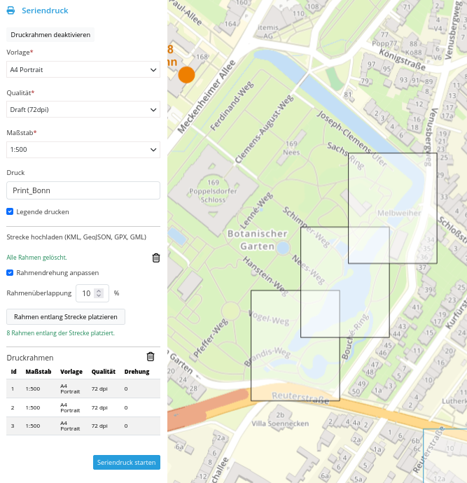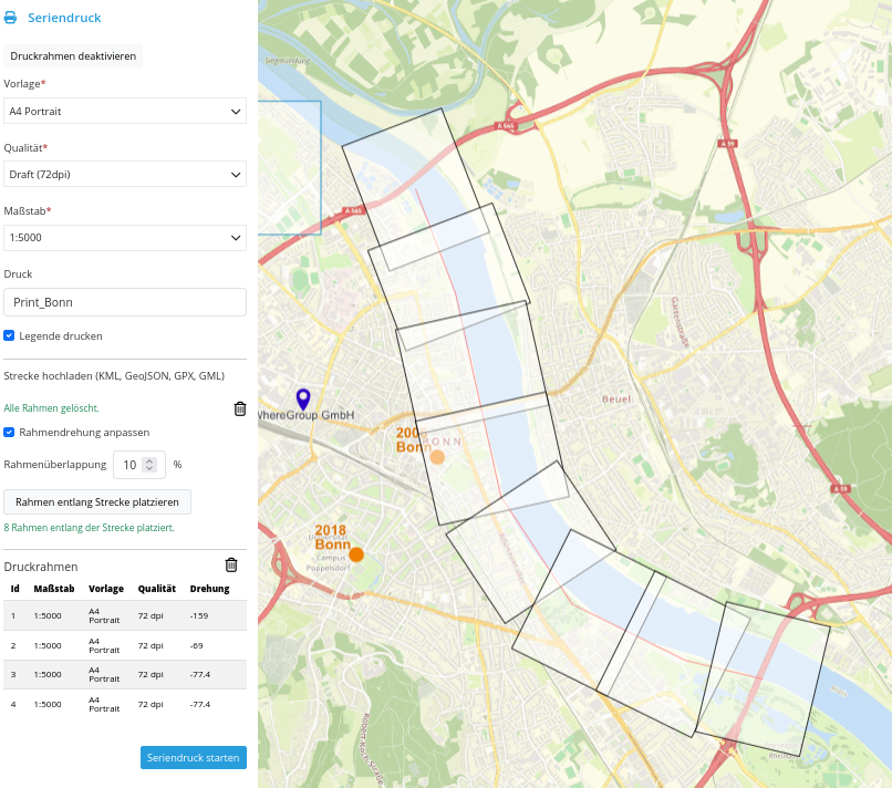 Der Seriendruck bietet zusätzlich die Möglichkeit, mehrere Druckrahmen zu definieren und zu drucken. Die Druckrahmen können durch Klicken auf die Karte platziert werden.